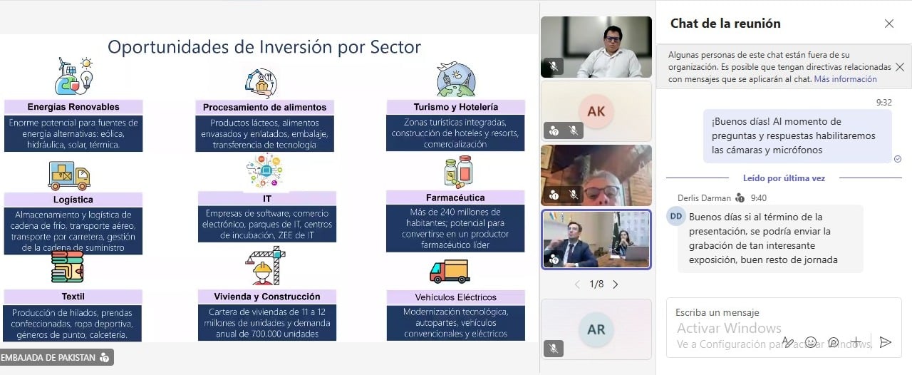 Durante el encuentro, se expuso un panorama económico actualizado, con indicadores que reflejan el dinamismo del mercado pakistaní, así como sectores con alto potencial de desarrollo, entre ellos el textil, farmacéutico, alimentos, tecnología y logística.